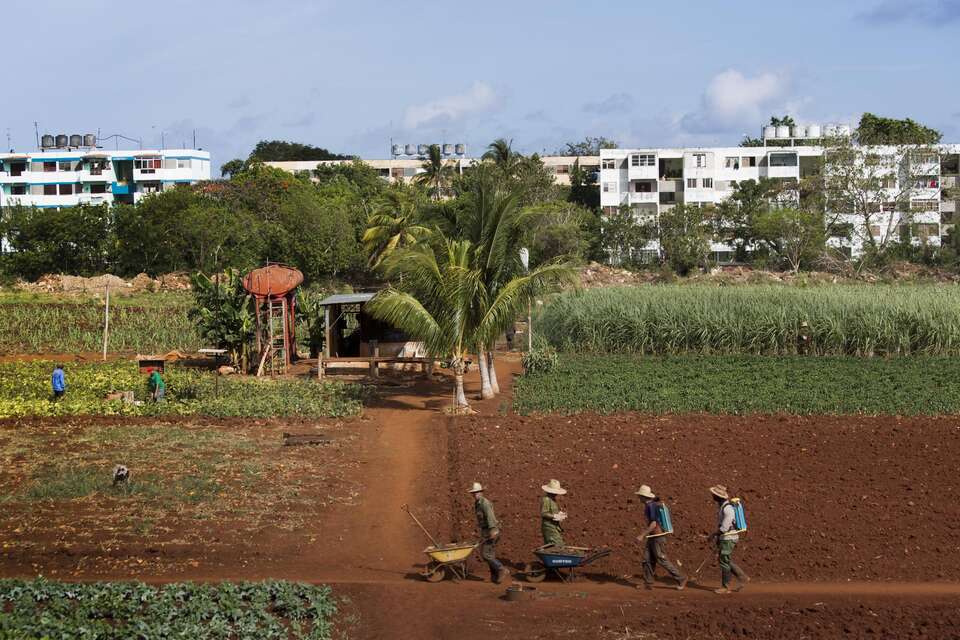 Inmitten einer sozialistischen Wohnsiedlung am Rande Havannas reihen sich grüne Beete hintereinander. Auf der urbanen Farm wird dreimal im Jahr geerntet: Mangos, Ananas und Papayas, aber auch Gemüsesorten wie Möhren und Rote Beete, Mangold und Kohl. Insgesamt 190 Frauen und Männer arbeiten in der bäuerlichen Kooperative, dessen Vorsitzender Salcines Lopez ist.