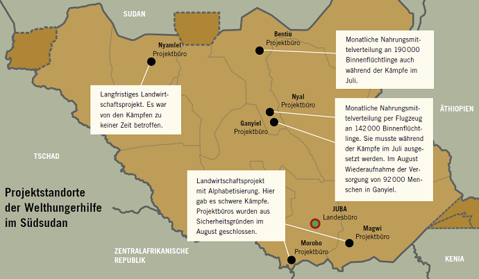 Bis zum Ausbruch der Unruhen hatten wir sechs Projekt-Standorte: In Bentiu, im größten Binnenvertriebenenlager der UN mit ca. 190.000 registrierten Binnenflüchtlingen, verteilen wir monatlich Nahrungsmittel. Und in den Sumpfgebieten Nyal und Ganyiel, die nur per Helikopter erreichbar sind, versorgen wir über Flugzeugabwürfe (Airdrops) fast 149.000 Menschen. In Teilen Unity States wird weiterhin gekämpft, sodass sowohl in Bentiu als auch in Ganyiel/Nyal zusätzliche IDPs angekommen sind. Darüber hinaus ist in Unity State Cholera ausgebrochen, in Ganyiel und Nyal verteilt die Welthungerhilfe daher Nothilfe-Kits mit WASH-Artikeln.In Nyamlel in Northern Bahr el Ghazal dagegen sind wir seit langem mit Landwirtschaftsprojekten vor Ort. Dort kann die Landwirtschaft die Menschen prinzipiell ernähren. Momentan gibt es auch dort einen massiven Nahrungsmangel aufgrund sehr hoher Preise, einer Schädlingsplage und weil es viel zu wenig geregnet hat. Da müssen wir die Projekte an die akute Notlage anpassen. Dann haben wir noch ein Projekt zur ländlichen Entwicklung und Alphabetisierung in Morobo und Magwi.