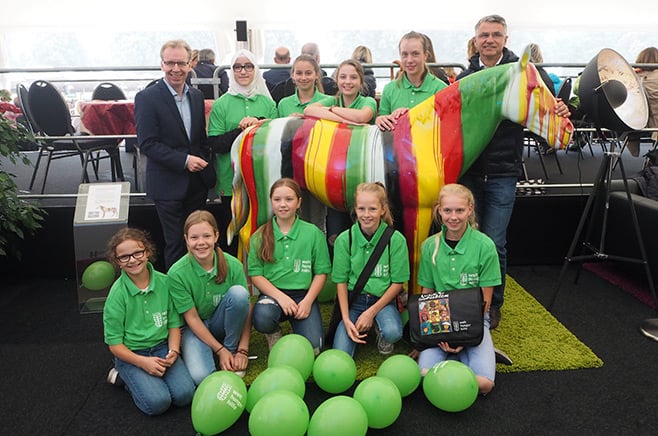 Direkt nach der Fohlenauktion am Sonntag wurde das bunte Pferd auf den Turnierplatz gerollt und von Adel Massoud und der JFGA GmbH für unglaubliche 5.000 Euro versteigert. Insgesamt konnten beim Turnier der Sieger in Münster sagenhafte 16.770 Euro gesammelt werden. Neben den engagierten Unterstützern von Reiten gegen den Hunger haben auch die Nachwuchsreiterinnen und Welthungerhilfe Botschafterinnen Marlene und Helena und deren fleißige Freunde in Münster einen großen Anteil am Erfolg. Die Spendensumme wurde von der westfälischen reiterlichen Vereinigung um Hendrik Snoek bei der Scheckübergabe noch spontan auf 20.000 Euro aufgerundet. Wir bedanken uns ganz herzlich bei allen Unterstützerinnen und Unterstützern.