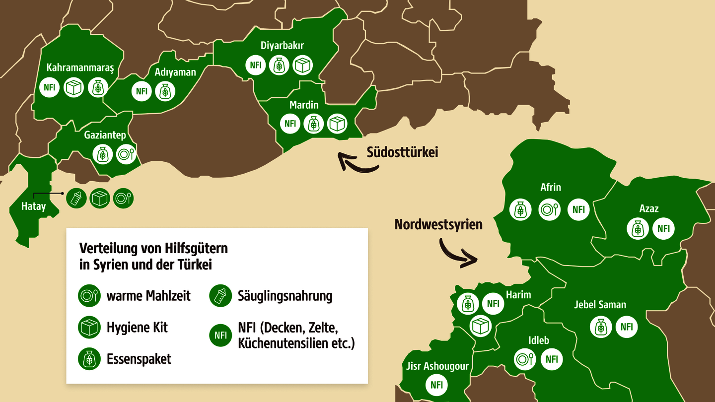 Die Welthungerhilfe hat ihre regulären Standorte in der Türkei in Gaziantep, in Kilis, Mardin und Hatay sowie in Istanbul und in den nordsyrischen Provinzen Idlib und Aleppo. Wir haben unsere Hilfsmaßnahmen in den betroffenen Gebieten unserer Standorte durchgeführt.