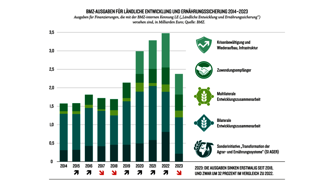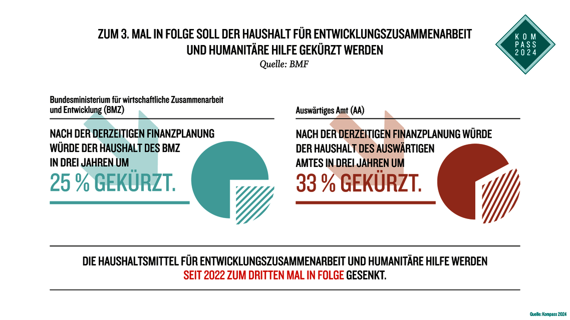 Als Folge des Sparzwangs wurde der Haushalt des Bundesentwicklungsministeriums für 2024 auf 11,22 Milliarden Euro und der Haushalt des Auswärtigen Amtes (AA), das die humanitäre Hilfe verantwortet, auf 6,7 Milliarden Euro gesenkt. Das ist ein Rückgang um acht beziehungsweise zehn Prozent.