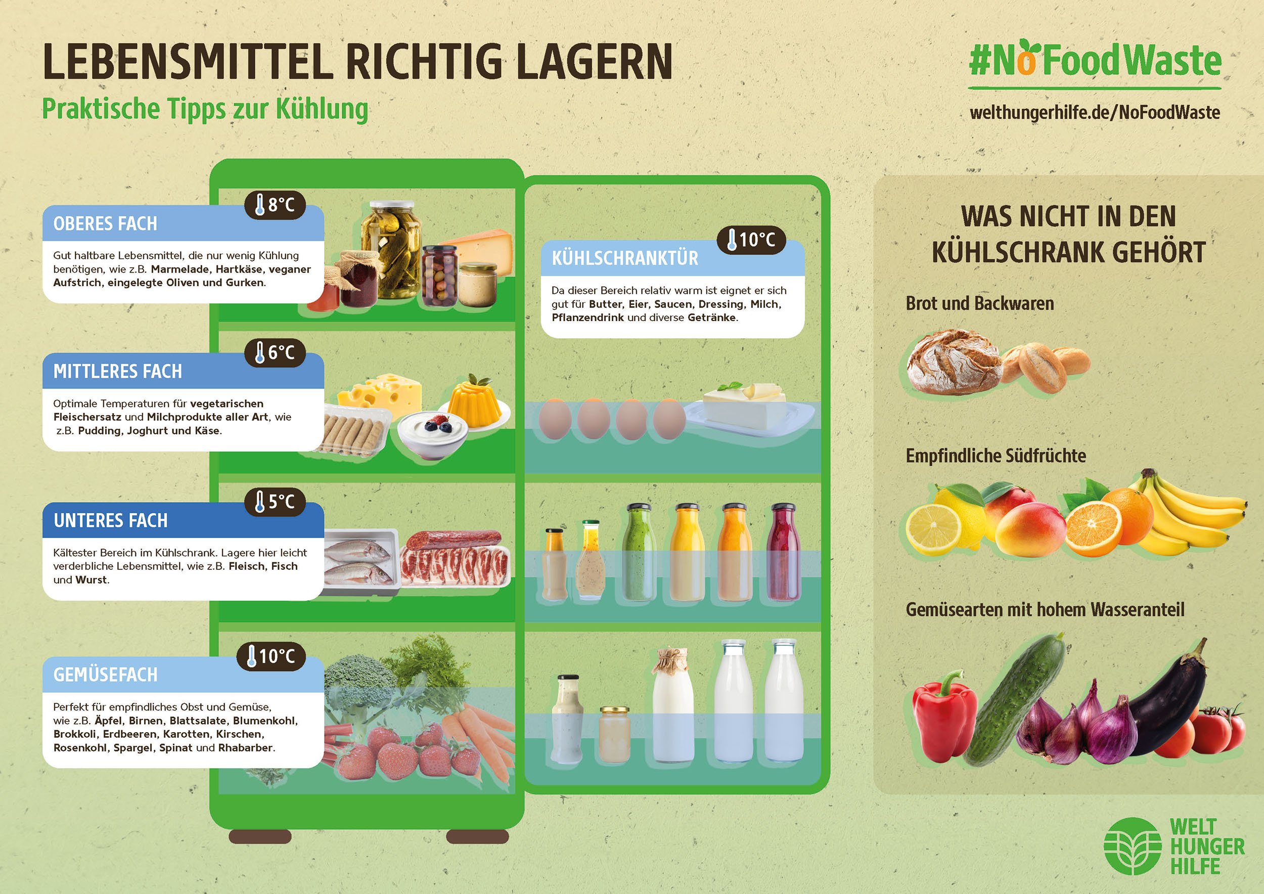 Achten Sie beispielsweise darauf, wie verschiedene Lebensmittel gelagert werden müssen, damit diese länger haltbar sind. Entdecken Sie weitere Tipps in unseren Informationsmaterialien und lassen Sie sich auch von unseren 10 Ideen gegen Lebensmittelverschwendung inspirieren!