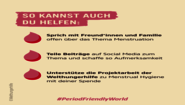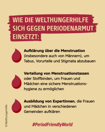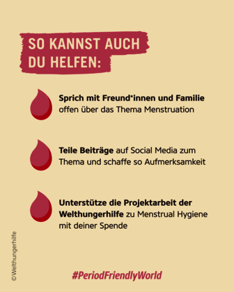 Teile rund um den Menstrual Hygiene Day Beiträge auf deinen Social Media Kanälen. Sprich offen über das Thema Menstruation und erzähle, was eine „Period Friendly World“ für dich bedeutet. Hier findest du Grafiken, die du für deine Social-Media-Beiträge nutzen kannst. Teile auch gerne Posts der Welthungerhilfe zum Menstrual Hygiene Day. So schaffen wir gemeinsam Aufmerksamkeit für die Menstruation, bauen Tabus und Scham ab und tragen zur einer #PeriodFriendlyWorld bei!