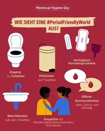Der Menstrual Hygiene Day 2024 hat ein klares Ziel: Together for a #PeriodFriendlyWorld. Gemeinsam können wir ein starkes Zeichen zur Enttabuisierung der Menstruation setzen und uns für eine Welt einsetzen, in der alle Menschen Zugang zu Menstruationsaufklärung, Periodenprodukten und hygienischen Toiletten haben.