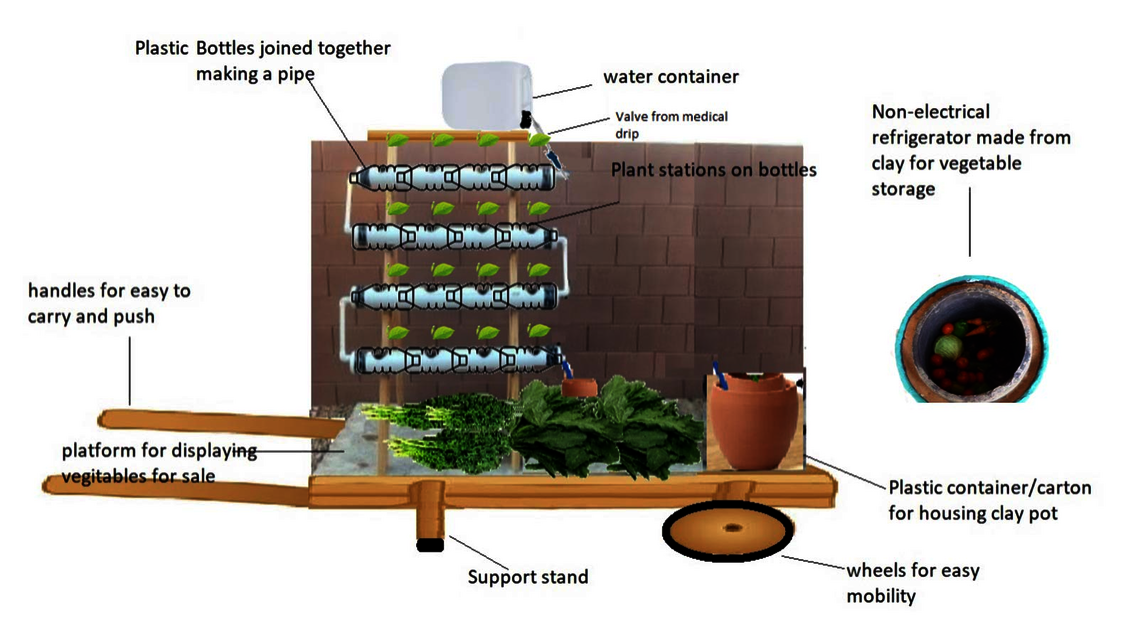 Idee: Ein bezahlbarer, platzsparender und transportabler Garten für den Anbau von Lebensmitteln für Verzehr und Verkauf mit integriertem nicht-elektrischem Kühlschrank für Geflüchtete