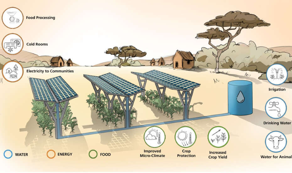 Die Agri-PV ermöglicht, ein Stück Land doppelt oder sogar dreifach zu nutzen, indem dort gleichzeitig landwirtschaftliche Produktion und Stromerzeugung stattfinden; zusätzlich kann potenziell Wassermanagement-Infrastruktur zum Einsatz kommen. Dazu werden Solarpaneele in Reihen auf erhöhten Ständern montiert und erzeugen erneuerbare Energie, während darunter oder dazwischen Nutzpflanzen angebaut werden. Die Paneele werfen Schatten und dienen auch als Schutz für die Pflanzen und den Boden, was potenziell den Ertrag und die Qualität der Ernte erhöht. Agri-PV trägt so zu jeder Komponente des WEF-Nexus bei und kann die Widerstandsfähigkeit der Landwirtschaft gegen den Klimawandel steigern.