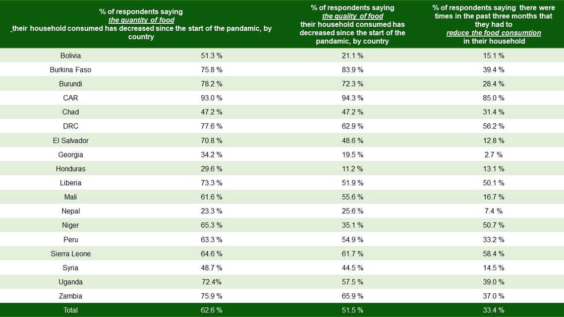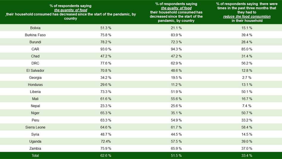 Mehr als die Hälfte der Haushalte (57 Prozent) gab an, dass ihr derzeitiges Einkommen nicht ausreicht, um ihren Bedarf an Nahrungsmitten zu decken. Der verschlechterte Zugang zeigt deutliche Auswirkungen: Bei einem Drittel der befragten Haushalte gingen in den ersten Monaten dieses Jahres Familienmitglieder hungrig zu Bett. Mehr als die Hälfte der Haushalte (51 Prozent) verzehrt Lebensmittel von schlechterer Qualität und sechs von zehn haben weniger auf dem Teller als vor der Pandemie.