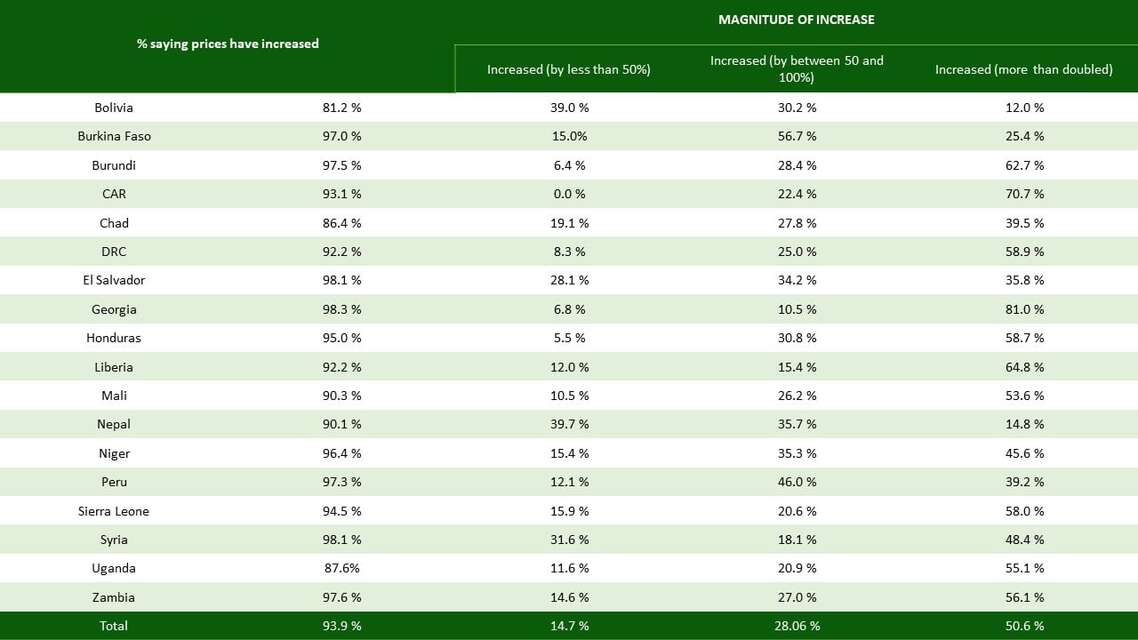 Gleichzeitig wurden die Haushalte vielerorts von steigenden Preisen für Grundnahrungsmittel getroffen, während Lebensmittel in lokalen Märkten in verringertem Maße verfügbar waren oder blieben. So gaben 94 Prozent der Befragten an, dass sich die Preise für Nahrungsmittel erhöht haben. 50 Prozent berichteten sogar von einer Verdopplung der Preise!