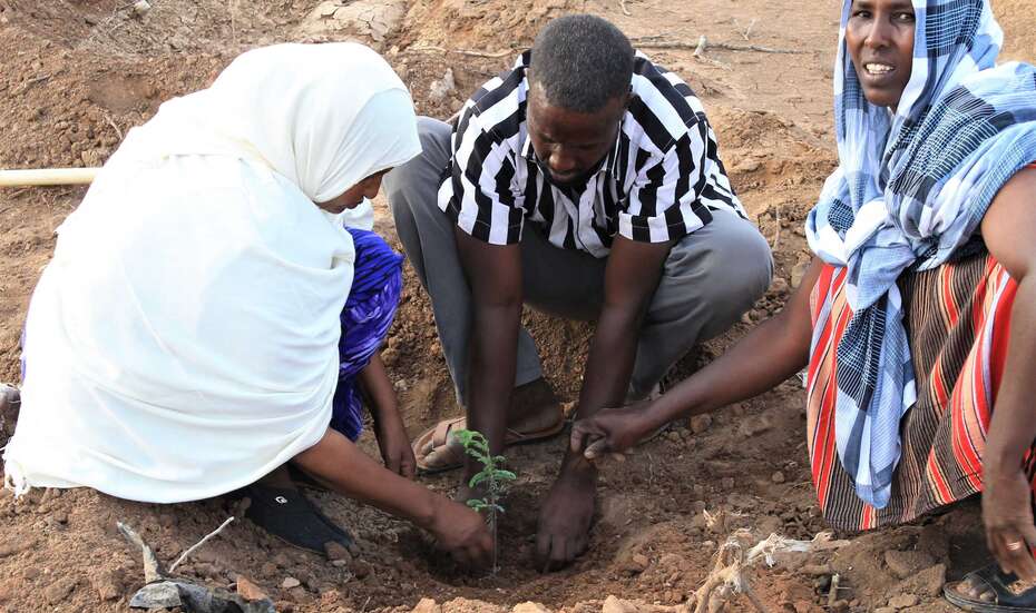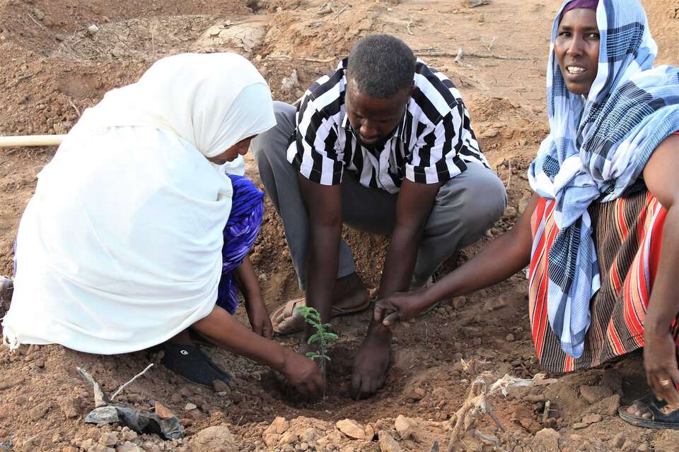 In Somaliland forsten die Bauern- und Hirtenfamilien gemeinsam mit der Welthungerhilfe Flächen wieder auf und errichten Schutzzonen gegen den Holzkohle-Raubbau. Der kostbare Regen wird mit einfachen Methoden „geerntet“: Auf den Höhenlinien entlang werden Erd- oder Steinwälle aufgeschüttet. Nach und nach terrassiert sich dadurch das Land, mehr Wasser kann versickern, statt ungenutzt abzufließen. So bleiben die Weiden länger grün, die flachen Brunnen in der Umgebung geben länger im Jahr Wasser und Futterbäume für Ziegen und Kamele gedeihen schneller.