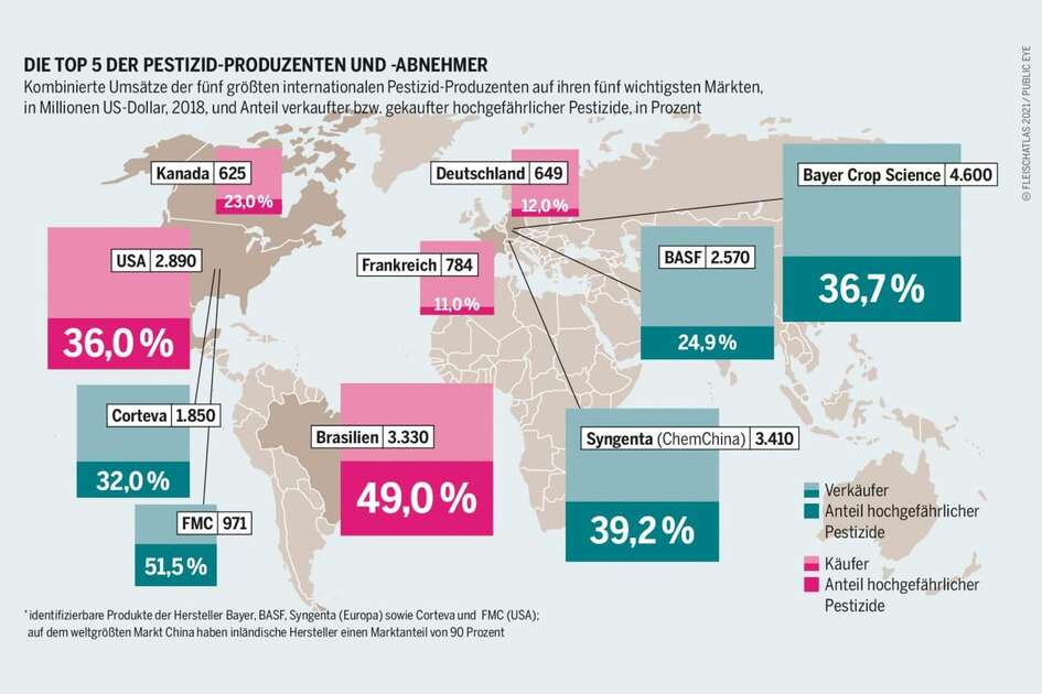 Die Nichtregierungsorganisation ETC Group hat berechnet, dass 2018 vier Konzerne (Bayer, Corteva, ChemChina and Limagrain) 67 Prozent des weltweiten Saatgutmarktes kontrollierten. Auch bei den Agrarchemikalien beherrschen nur vier Konzerne 70 Prozent des weltweiten Marktes. Im Getreidehandel halten die größten vier Unternehmen gar 90 Prozent der Marktanteile. Ein Verhältnis vergleichbar mit den deutschen Supermärkten: Vier große Ketten dominieren etwa 85 Prozent des Marktes (Mooney 2018).