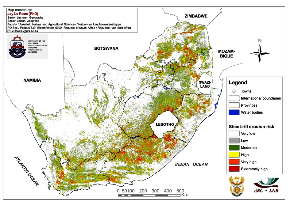 Le Roux, J.J., Morgenthal, T.L., Malherbe, J., Sumner, P.D., Pretorius, D.J., 2008. Water erosion prediction at a national scale for South Africa. Water SA 34(3), 305-314. ISSN 1816-7950.