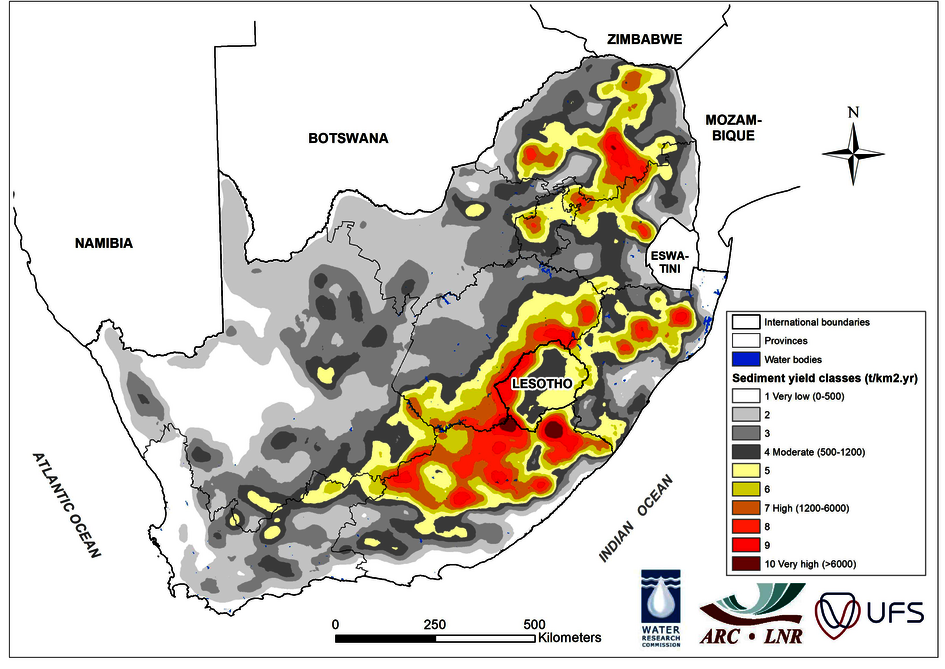 Angesichts der zunehmenden Gefahr der Verschlammung von Stauseen erkannte die Wasserforschungskommission (WRC) die Notwendigkeit, die ursprüngliche Karte der Sedimentfrachten Südafrikas zu verbessern (Rooseboom et al. 1992). Daraufhin wurde eine überarbeitete Karte erstellt, die die neuesten Daten zur Sedimentablagerung in Stauseen in wahrscheinlichkeitstheoretischen und empirischen Modellen verwendet (Msadala et al. 2010). Abbildung 3 zeigt, dass die höchsten Ablagerungen in den östlichen Teilen des Landes, einschließlich der Lowlands von Lesotho, vorhergesagt werden.