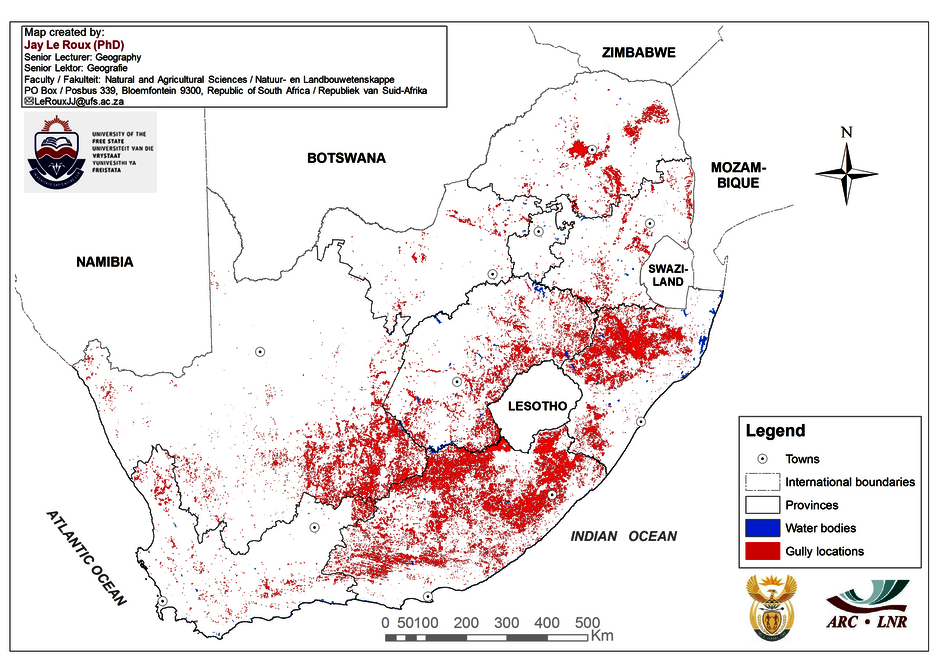 Mararakanye, N., Le Roux, J.J., 2012. Gully erosion mapping at a national scale for South Africa. South African Geographical Journal 94(2), 208-218. doi.org/10.1080/03736245.2012.742786.