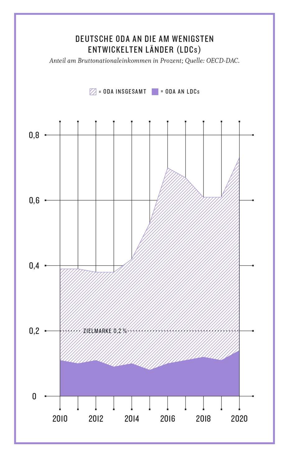 Weil das so ist, fordern die beiden Organisationen von der Bundesregierung, das Ziel, 0,7 Prozent des Bruttonationaleinkommens (BNE) für staatliche Entwicklungszusammenarbeit (ODA) auszugeben, als Mindestziel und nicht als Zielmarke festzulegen – so wie es auch im Koalitionsvertrag der Ampel steht. Wie schon in den vergangenen Jahren fordern sie zudem, dass die Bundesregierung 0,2 Prozent des BNE für die Zusammenarbeit mit den am wenigsten entwickelten Ländern zur Verfügung stellt; bislang sind es nur 0,14 Prozent (2020).