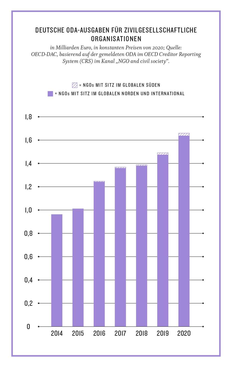 In der Entwicklungszusammenarbeit und der humanitären Hilfe spielen zivilgesellschaftliche Organisationen eine wichtige Rolle: „Sie können als Impulsgeberinnen eigene Projekte umsetzen, als Bindeglied zwischen Bevölkerung und Staat die Anliegen der Menschen einfordern, als Watchdog die Einhaltung der Menschenrechte und der staatlichen Rechenschaftspflicht sicherstellen, oder als Dienstleisterinnen unterstützende Maßnahmen zur Basisversorgung durchführen.“ Auch deshalb stellten die Mitglieder des OECD-Entwicklungsausschusses (DAC) im Jahr 2020 durchschnittlich 14,6 Prozent ihrer bilateralen Entwicklungsgelder für zivilgesellschaftliche Organisationen zur Verfügung.