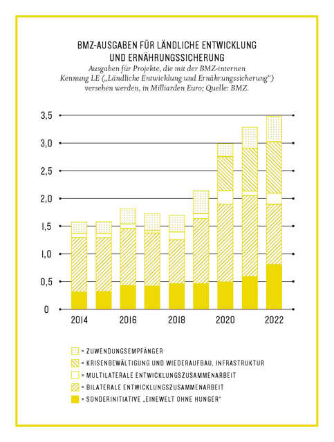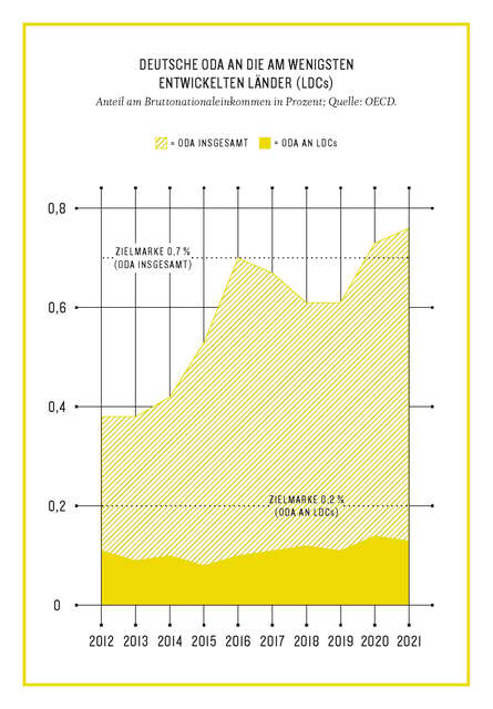 Eben diese Krisenfolgen haben den prozentualen Anteil der Entwicklungsausgaben am Bruttonationaleinkommen (BNE) zum dritten Mal in Folge über die wichtige Mindestzielmarke von 0,7 Prozent steigen lassen. Die Zielmarke besteht seit 1970 und wurde, außer in den vergangenen drei Jahren, nur 2016 erreicht – also in 53 Jahren nur viermal. Trotz des Anstiegs deutscher Ausgaben für Entwicklungszusammenarbeit auf Rekordhöhe bewegen sich die anteiligen Ausgaben für die am wenigsten entwickelten Länder (LDCs) auf einem Niveau wie vor etwa zehn Jahren. 0,2 Prozent des BNE lautet hier das Ziel – und wird regelmäßig mit Werten um 0,13 deutlich unterschritten.