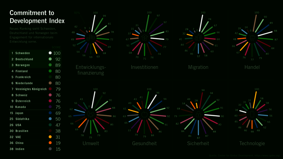 Der Commitment to Development Index (CDI) des in Washington und London ansässigen Thinktanks Center for Global Development bewertet in seiner neuesten Ausgabe 40 einflussreiche Länder danach, wie sie sich für internationale Entwicklung einsetzen. Dabei verstehen die Autoren unter Entwicklung weit mehr als die Ausgaben für Entwicklungszusammenarbeit und humanitäre Hilfe. Anhand von insgesamt mehr als 40 Indikatoren listet der Index Rangfolgen für acht Politikbereiche auf: die Quantität der staatlichen Auslandshilfe und ihre Qualität, Investitionen, Migration, Handel, Umwelt, Gesundheit, Sicherheit und Technologie. Aus der Zusammenfassung der acht Bereiche ergibt sich eine Rangfolge für das Gesamt-Engagement.