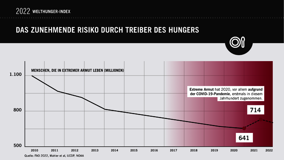 Verheerende Entwicklungen bei den weltweiten Nahrungsmittelpreisen, wieder steigende extreme Armut, eine Verdoppelung der Kriege und Konflikte und zunehmende Temperaturanomalien bieten kein geeignetes strukturelles Umfeld, um den Hunger zu überwinden.