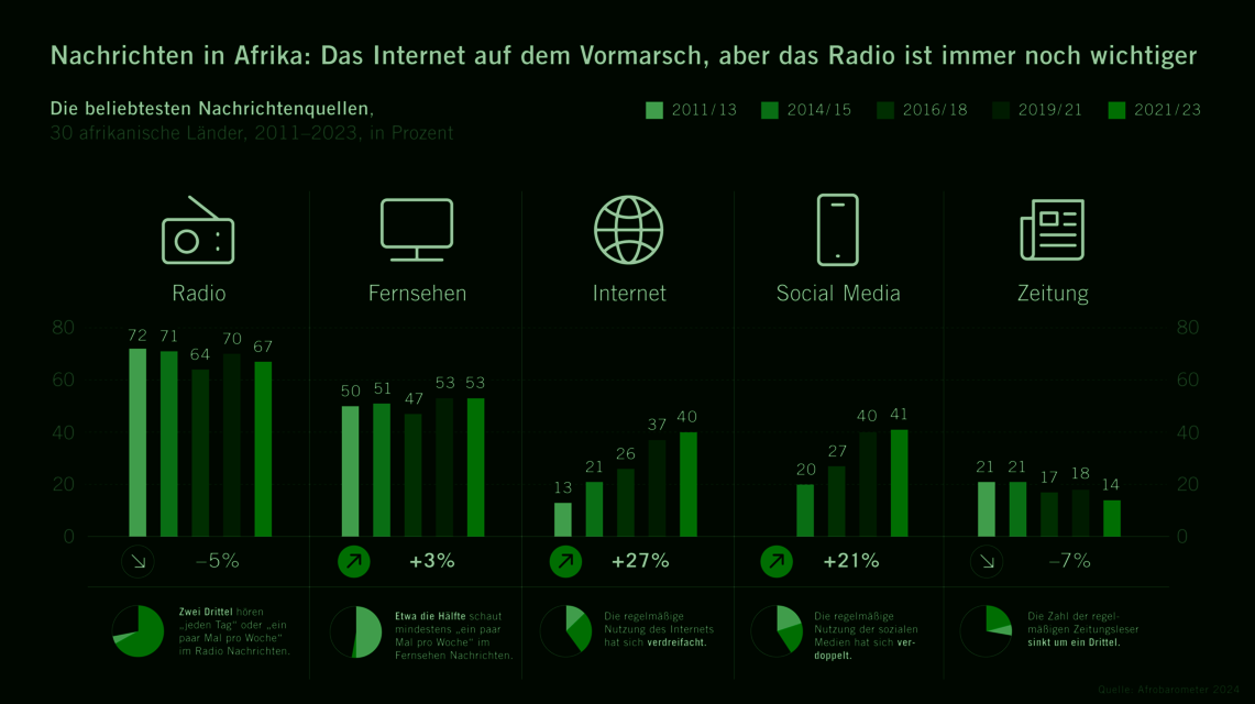 Woher beziehen Afrikaner gewöhnlich ihre Nachrichten? Mit dieser Frage beschäftigte sich kürzlich Afrobarometer, ein unabhängiges afrikanisches Forschungsnetzwerk, das national repräsentative Umfragen zu Demokratie, Regierungsführung und Lebensqualität durchführt. Aktuelle Umfragen von Afrobarometer zeigen, dass das Radio als Quelle für regelmäßige Nachrichten immer noch vor allen anderen Kanälen liegt. Der Anteil der digitalen Nachrichtenkonsumenten hat allerdings auch in Afrika im letzten Jahrzehnt dramatisch zugenommen.