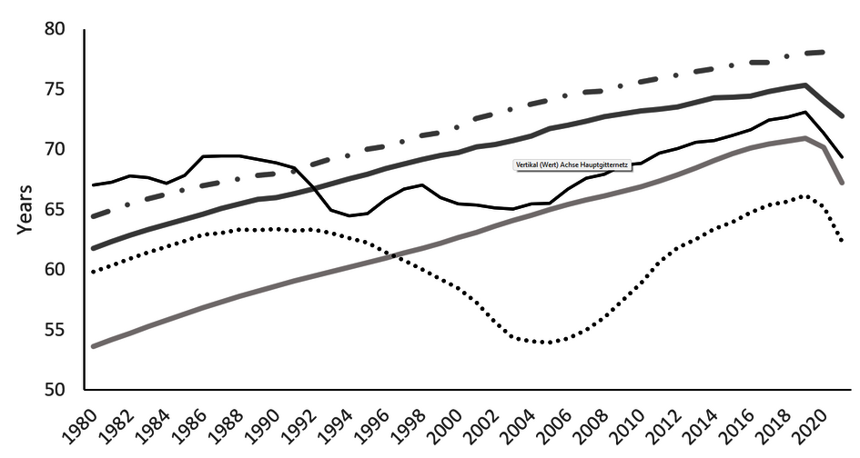 Schaubild 4: Lebenserwartung in Jahren der BRICS-Staaten 1961-2021