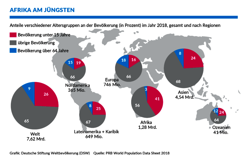 Afrika hingegen bleibt der Kontinent mit der jüngsten Altersstruktur. Mit einem Durchschnittsalter von 19,4 Jahren war Afrika 2019 mit Abstand die Region mit der jüngsten Bevölkerung. Alle elf Staaten, in denen Frauen im Laufe ihres Lebens durchschnittlich mehr als fünf Kinder bekommen, lagen 2019 in Afrika: Angola, Burkina Faso, Burundi, Tschad, DR Kongo, Gambia, Mali, Niger, Nigeria, Somalia und Uganda. Spitzenreiter ist das bitterarme und von Konflikten geplagte Niger. Dort bekommen Frauen in ihrem Leben durchschnittlich sieben Kinder.