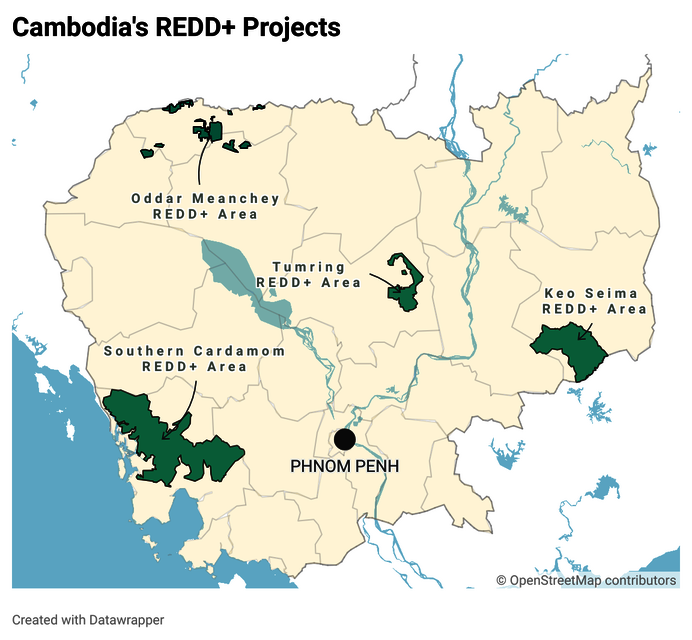 Die vier laufenden REDD+-Projekte in Kambodscha zeigen eine ähnliche Entwicklung. Daten von Global Forest Watch zufolge ist die Gesamtfläche des ursprünglichen Regenwalds in Keo Seima REDD+ seit Beginn des Projekts im Jahr 2010 um 32 Prozent geschrumpft. Im Southern Cardamom REDD+-Projekt hat sich die durch Entwaldung verlorene Fläche zwischen 2022 und 2023 demnach mehr als verdoppelt. Die Waldfläche im dritten REDD+-Projekt Kambodschas, Tumring, sei im Vergleich zu 2011 um 66 Prozent kleiner geworden. Seit das Projekt 2014 initiiert wurde, gibt es Berichte über stetig fortgesetzte Entwaldung. In Oddar Meanchey, dem ersten 2008 im Land eingerichteten REDD+-Projekt, soll die Waldfläche seit 2000 um 35 Prozent zurückgegangen gegangen sein. Die für die Umsetzung der REDD+-Projekte verantwortlichen NRO haben nicht auf Interview-Anfragen reagiert.