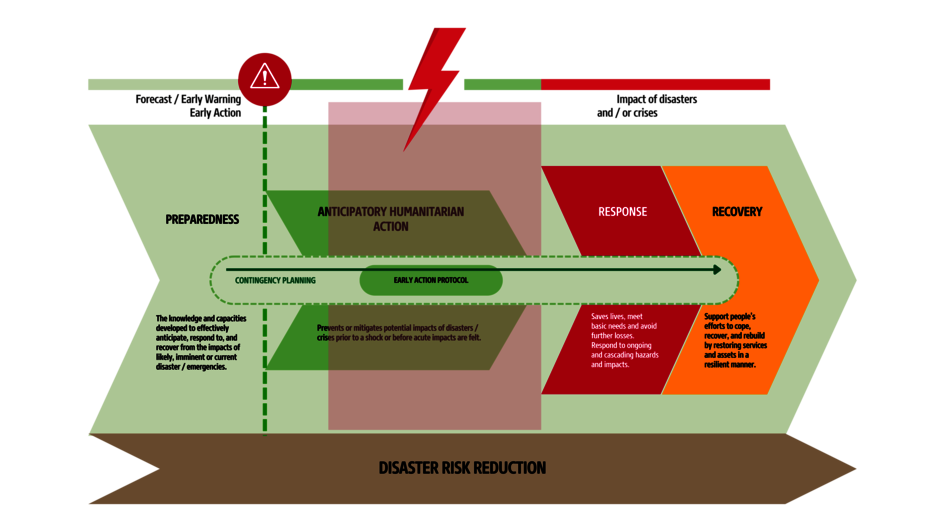 Vorausschauende humanitäre Hilfe (AHA) (2) basiert auf wirkungsorientieren Vorhersagen (3), die eine mögliche Gefahr, Exposition und Vulnerabilität sowie Auswirkungen prognostizieren. AHA wird ausgelöst, sobald ein vorher festgelegter Schwellenwert erreicht wird, d.h. ein Punkt, an dem die Wahrscheinlichkeit, dass die beobachtete Gefahr eintritt und zu schwerwiegenden Folgen führt, so hoch ist, dass frühzeitiges Handeln notwendig ist. Dann wird ein so genanntes Early Action Protocol (EAP) in Gang gesetzt, das festlegt, wer was wann tut. Dieser Ansatz ist mit einer vorab vereinbarten Finanzierung verbunden, die eine rechtzeitige Bereitstellung finanzieller Mittel und damit die Durchführung der "Early Action"-Maßnahmen ermöglicht. AHA findet also in dem Zeitfenster zwischen einer Frühwarnung und dem Eintreten einer bestimmten Gefahr oder ihrer höchsten Schadenswirkung statt (s. Grafik unten). Wichtig: AHA-Maßnahmen unterscheiden sich von traditioneller Katastrophenvorsorge und „Preparedness“, da sie immer auf eine konkrete, unmittelbare Gefahr bezogen sind.