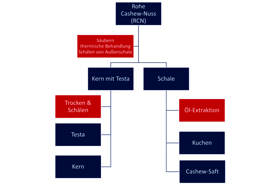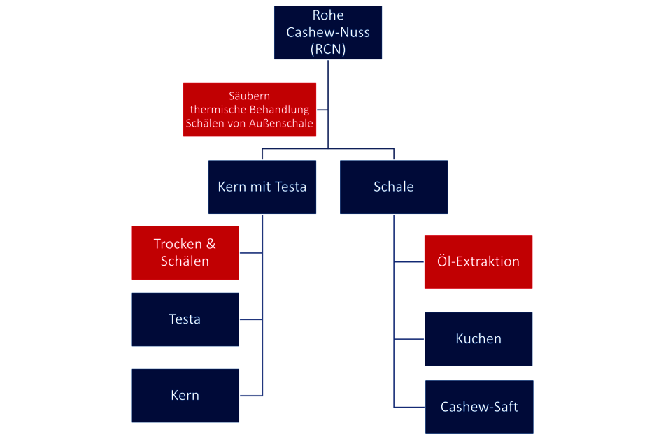 Dabei werden die rohen Cashewnüsse wie folgt weiterverarbeitet: