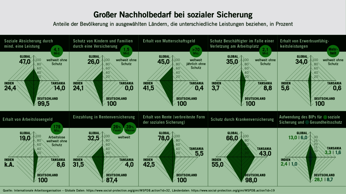 Dass der soziale Schutz global und in vielen Ländern so schlecht ist, hängt auch mit den fehlenden Investitionen in diesen Bereich zusammen – und der mangelnden Priorität, die viele Regierungen ihm einräumen. Weniger als 13 Prozent des globalen Bruttoinlandsprodukts werden für soziale Sicherung aufgewendet, in Tansania nur 3,3 Prozent, in Indien 2,4 Prozent, in Deutschland 28.1 Prozent.
