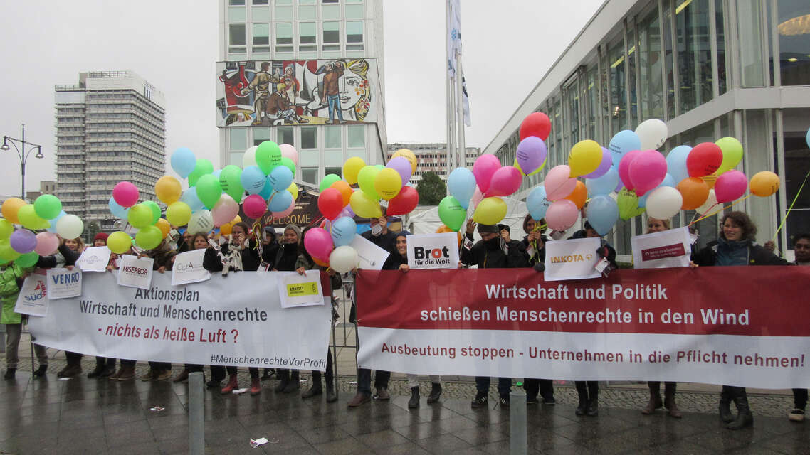 - "Wir setzen uns für eine konsequente Umsetzung des Nationalen Aktionsplans Wirtschaft und Menschenrechte (NAP) ein, einschließlich des öffentlichen Beschaffungswesens. Falls die wirksame und umfassende Überprüfung des NAP 2020 zu dem Ergebnis kommt, dass die freiwillige Selbstverpflichtung der Unternehmen nicht ausreicht, werden wir national gesetzlich tätig und uns für eine EU-weite Regelung einsetzen."